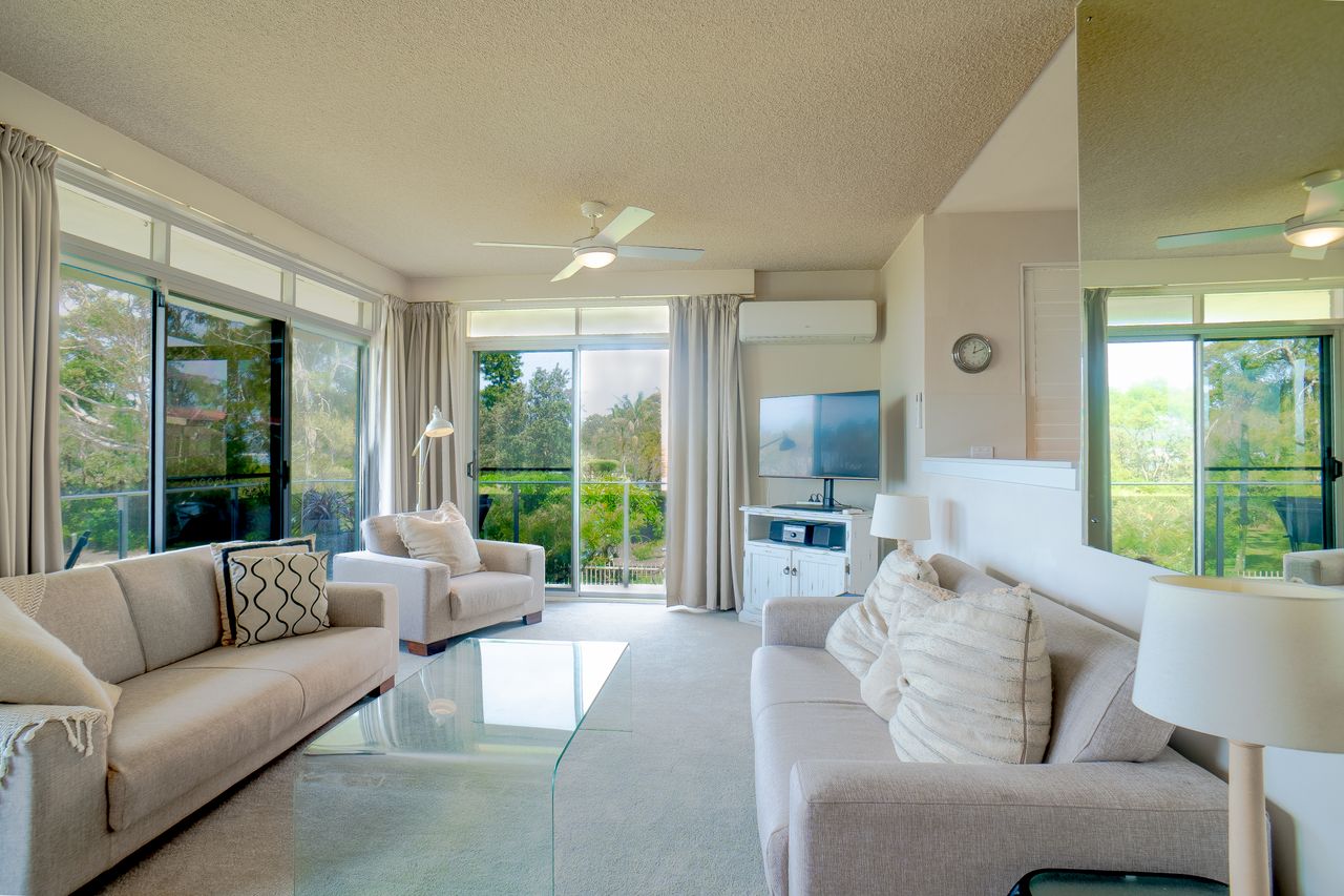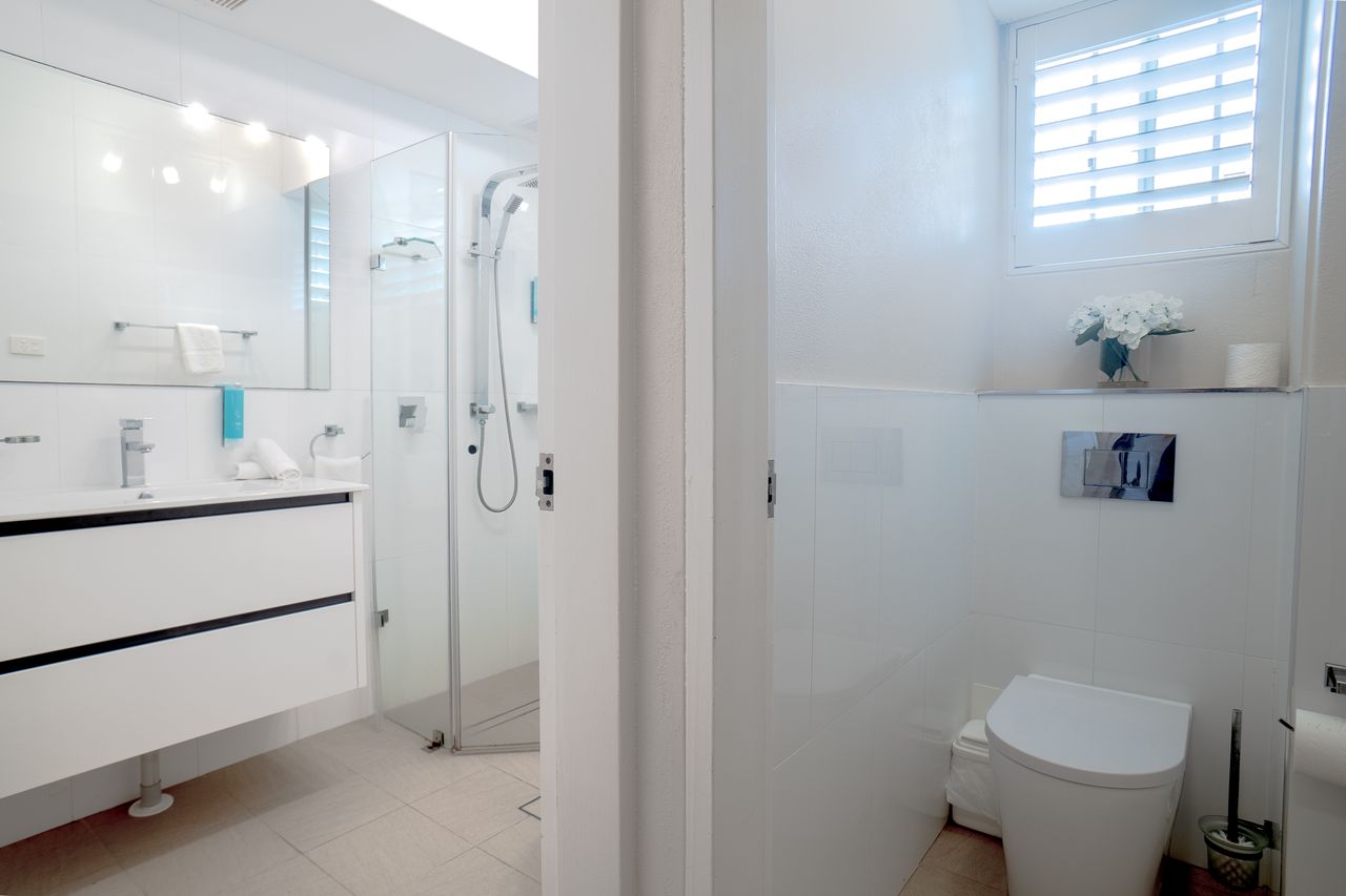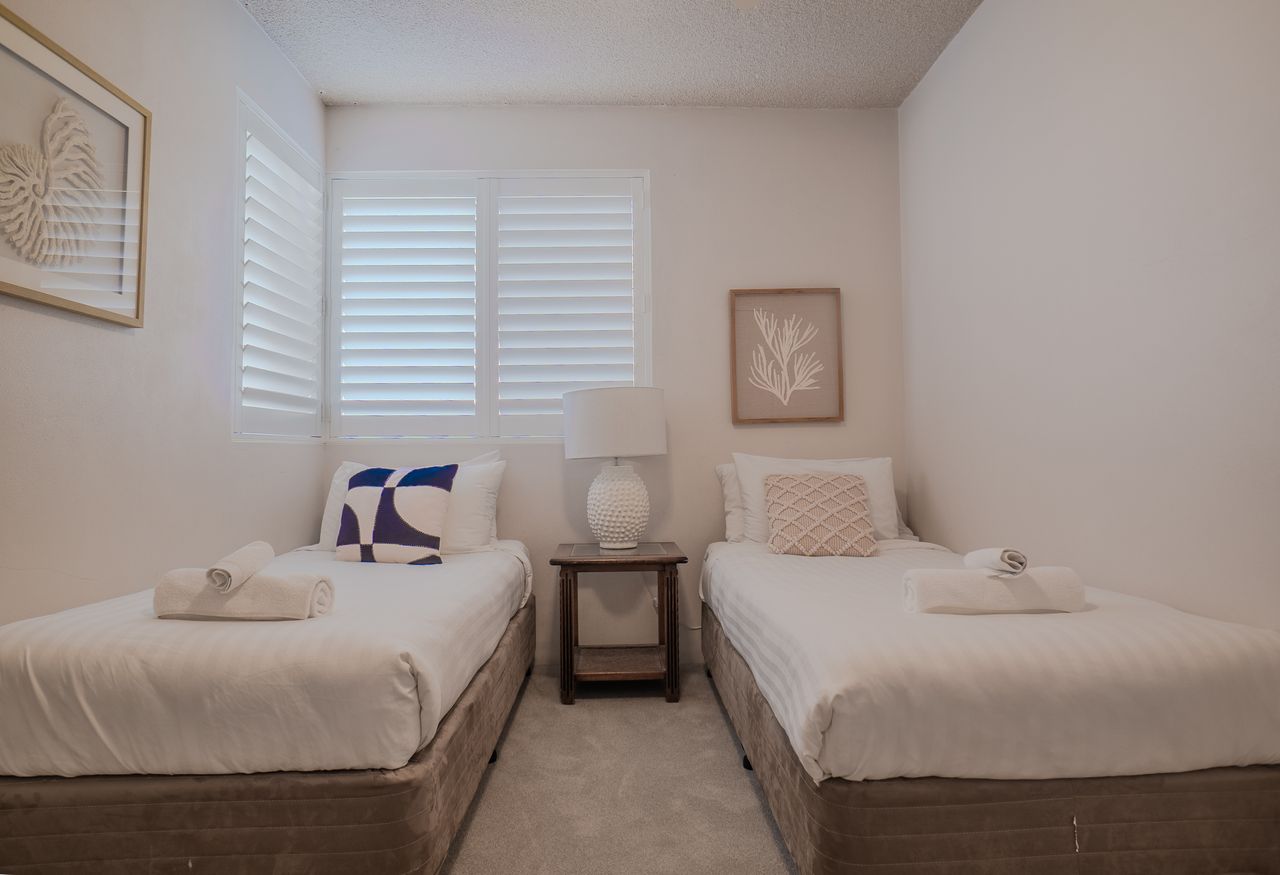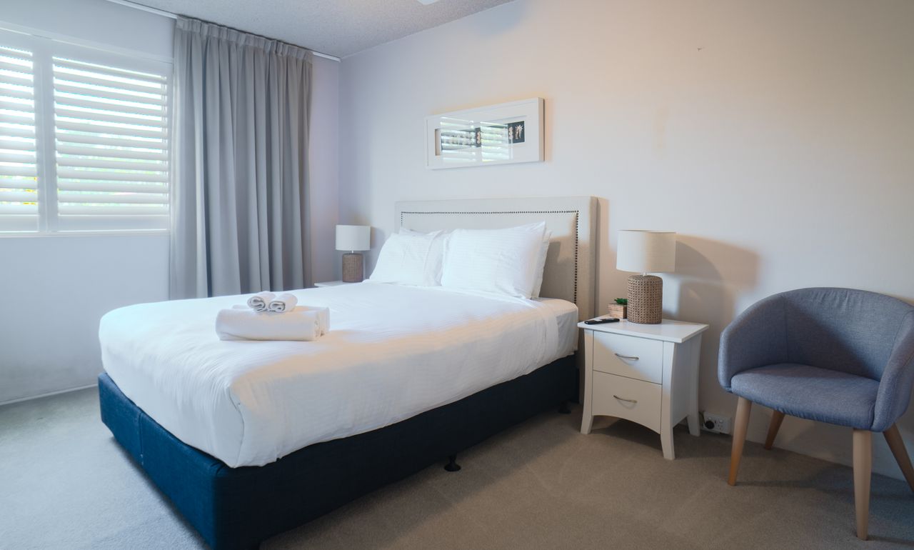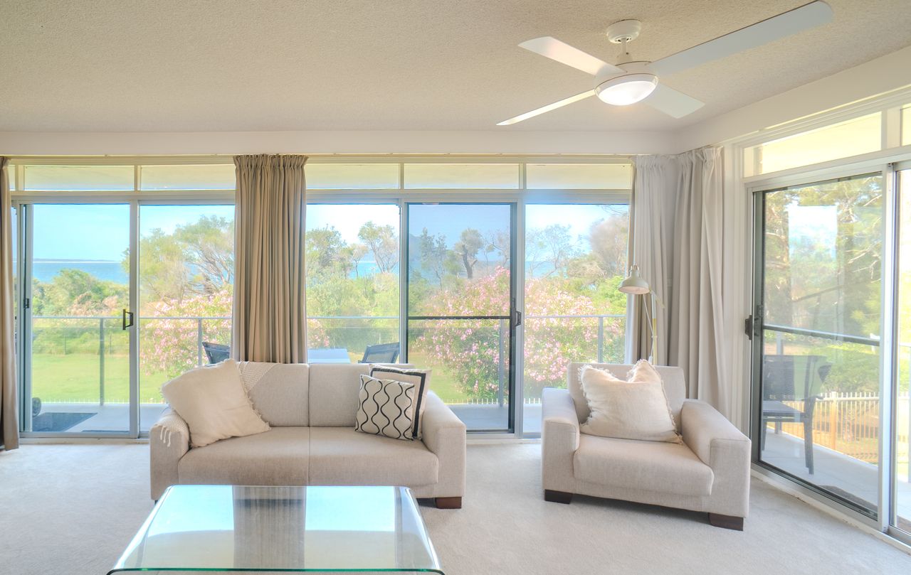 This gorgeous, renovated apartment on the first floor provides a wonderful base for your relaxing seaside break. The north-facing balcony overlooks the leafy reserve, through to the sparkling turquoise waters that Port Stephens is known for. Sit out in the salty air, cook up a fresh seafood feast on the electric BBQ and enjoy alfresco dining with beautiful views. A wall of glass means natural light floods the air-conditioned, open living room and you can also enjoy the view from indoors while relaxing on the plush couch watching the 43″ Smart TV with NBN WIFI and DVD player, dining at the 6-seater table or cooking in the fully equipped kitchen which includes a dishwasher, stove, microwave and full size fridge. Child proof screens allow the windows to fully open safely so the fresh sea breeze and calming sound of the waves filter through the apartment, complementing the charming coastal décor.