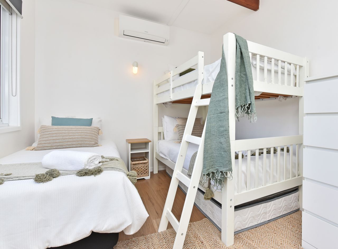 Bedroom 2 (upstairs) – Single Bed + Single Bunk (top bed not made) + Split System Air Conditioner + Linen + Bed Making