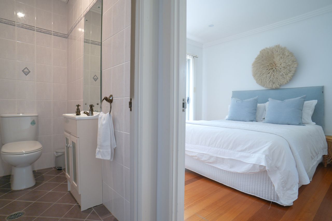 The Summer House accommodates up to 8 guests, featuring two fully separate living areas and dining zones, ideal for families or groups. Upstairs offers an open-plan living and dining space with a full kitchen, a queen bedroom with ensuite, guest powder room, and balcony access with BBQ facilities. Downstairs provides a second living area with a kitchenette, one queen bedroom, a third bedroom with multiple bedding options, two full bathrooms, and a laundry.