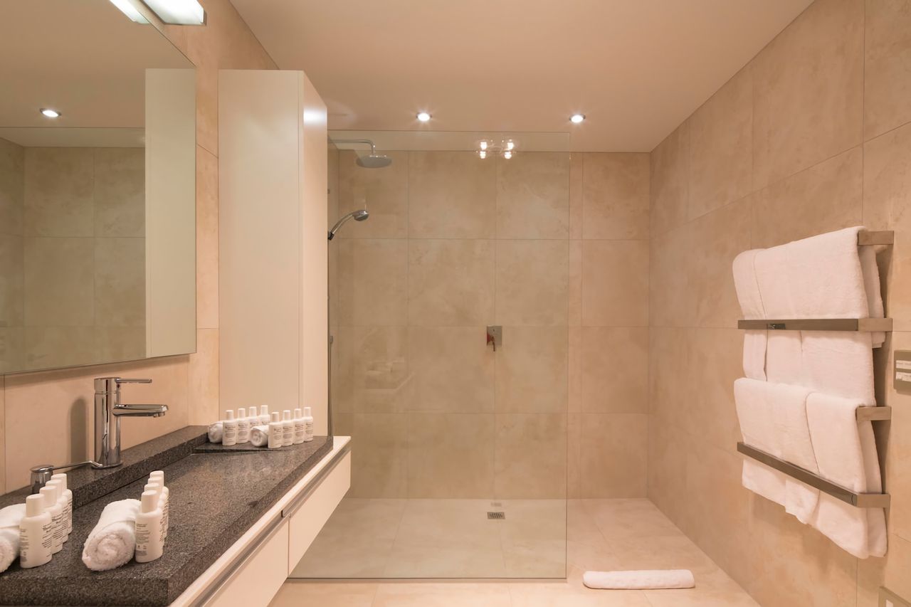 The shared bathroom and en suite feature rain-head showers, heated towel rails, hair dryers, premium toiletries, and underfloor heating. An extra guest toilet is conveniently located on the main living level.