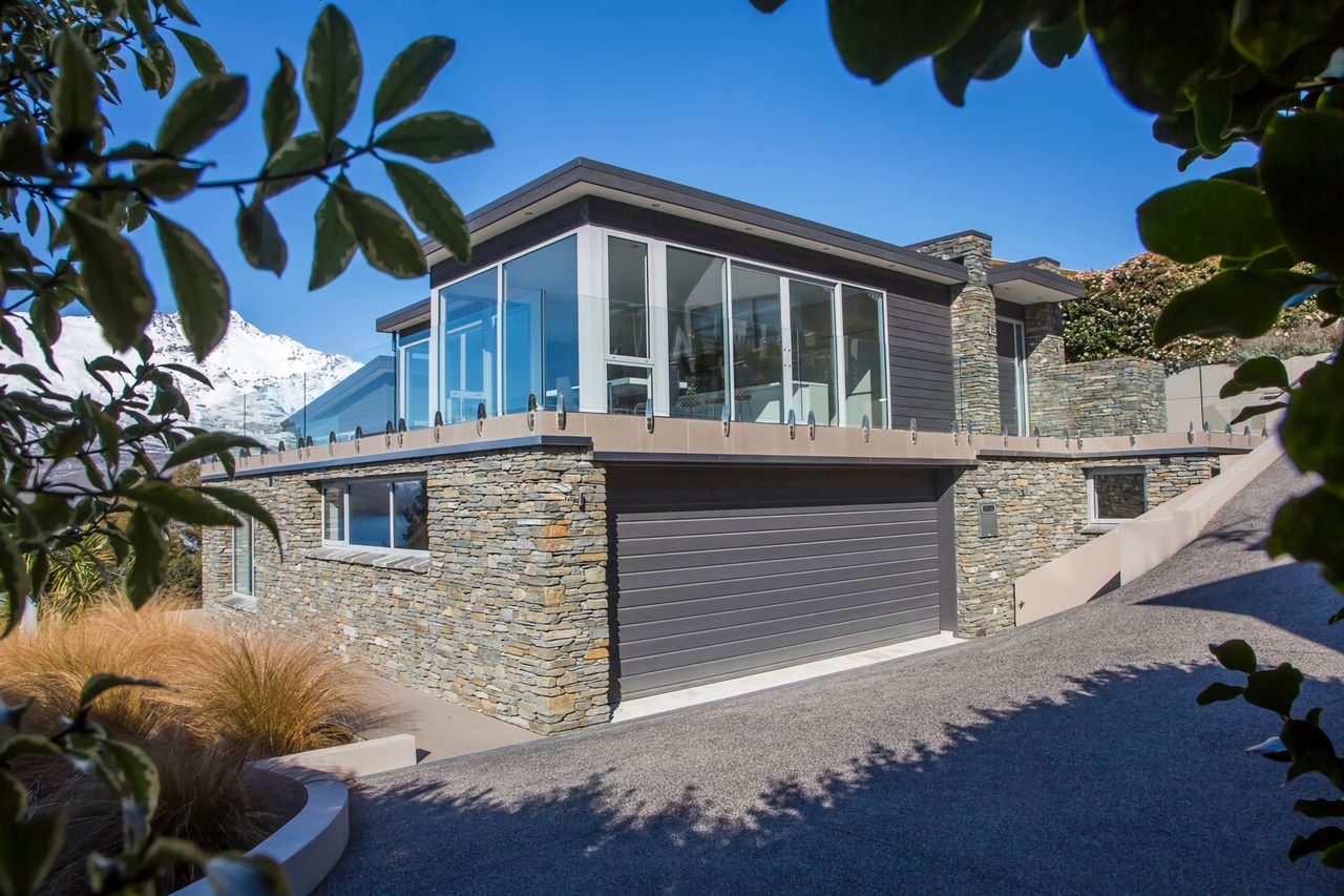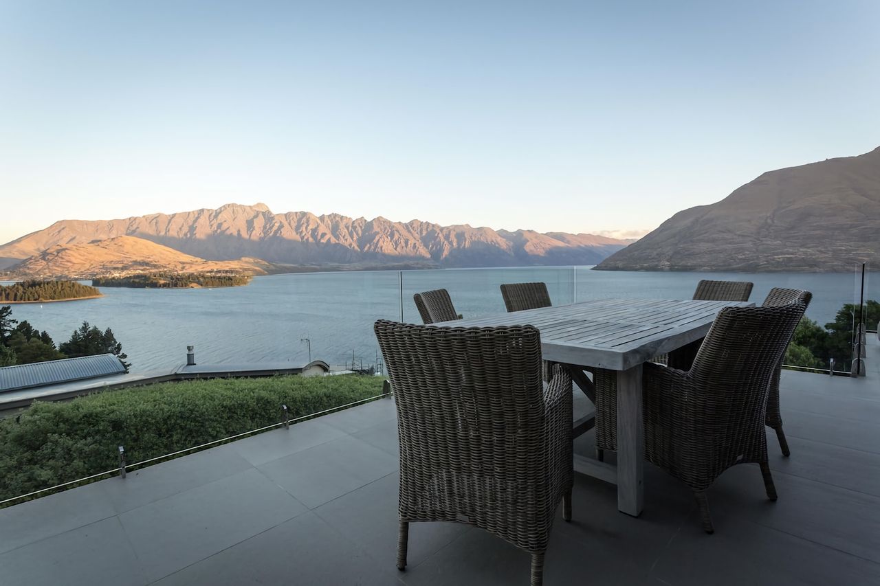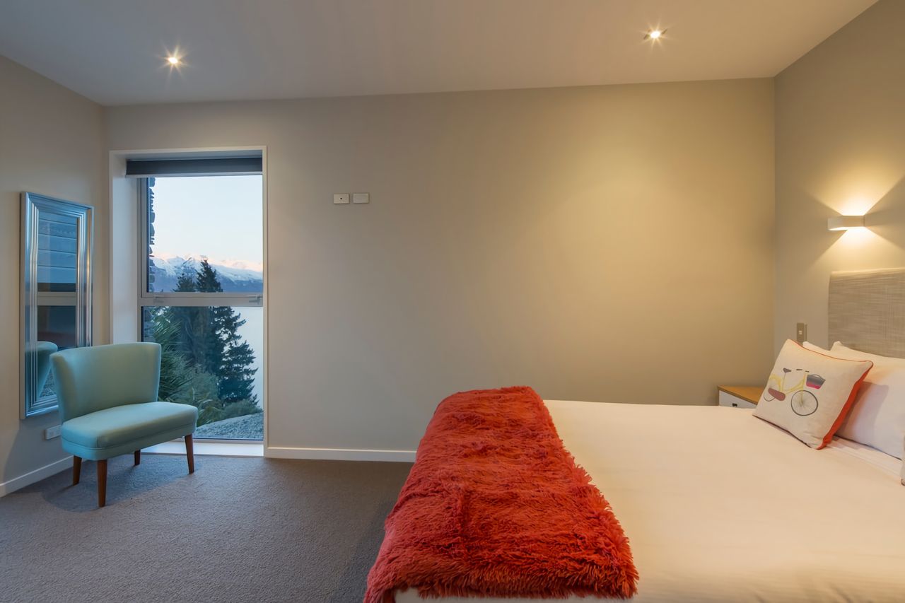 The master bedroom, complete with an ensuite and glass-to-ceiling windows, graces the middle level and boasts the captivating panoramic views of Lake Wakatipu and The Remarkables that every Queenstown traveller desires. The second and third bedrooms are situated on the lower level, offer similar stunning lake and mountain views and open onto an adjacent outdoor balcony. The slightly smaller fourth bedroom resides on this level as well, along with the shared bathroom.