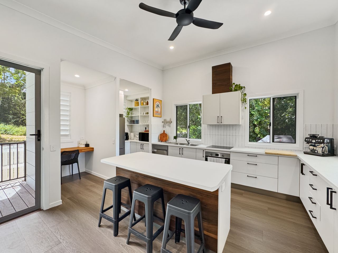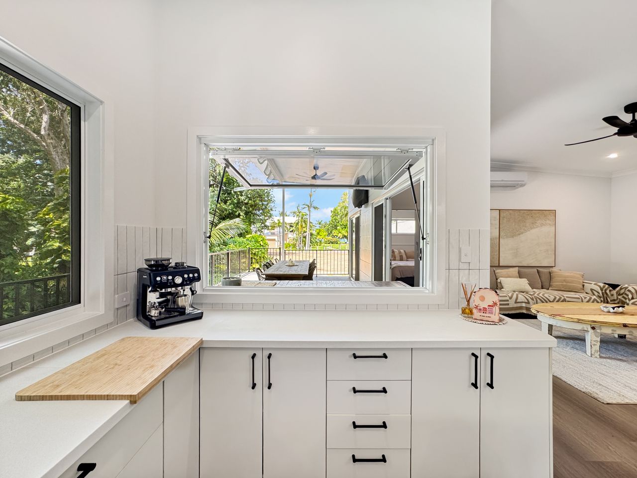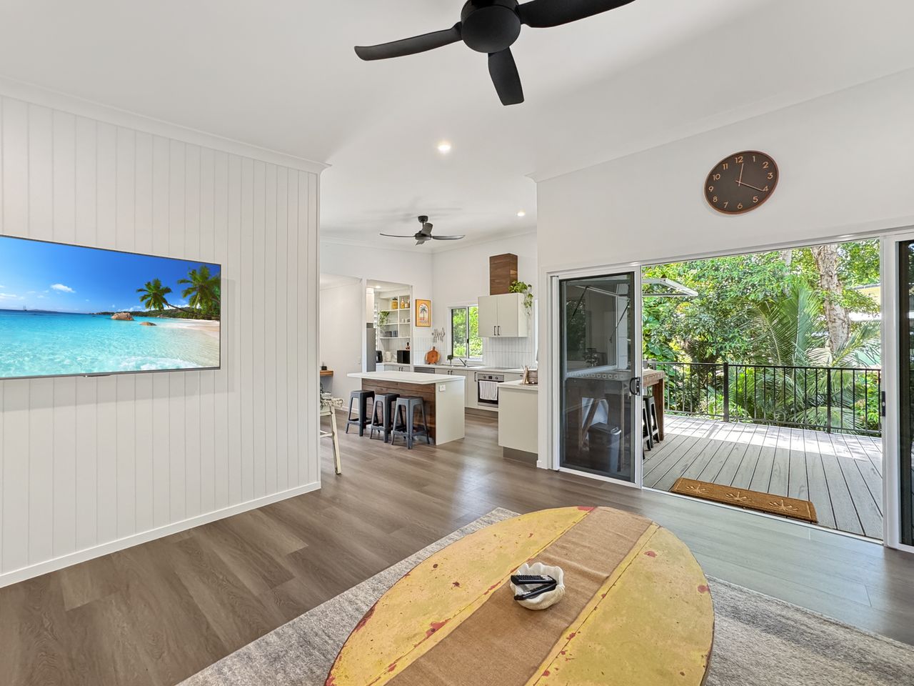 The heart of the home is a bright, open living area that encourages easy indoor-outdoor living. The kitchen and lounge connect seamlessly to an inviting outdoor space, perfect for long breakfasts, sunset dinners, or simply enjoying the cooling island breezes in a peaceful setting.
