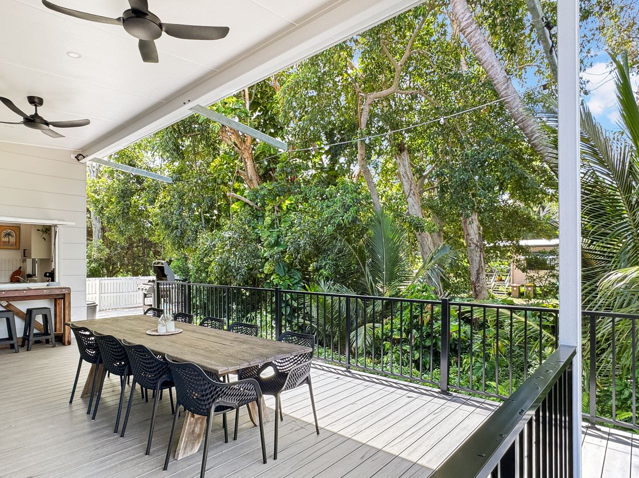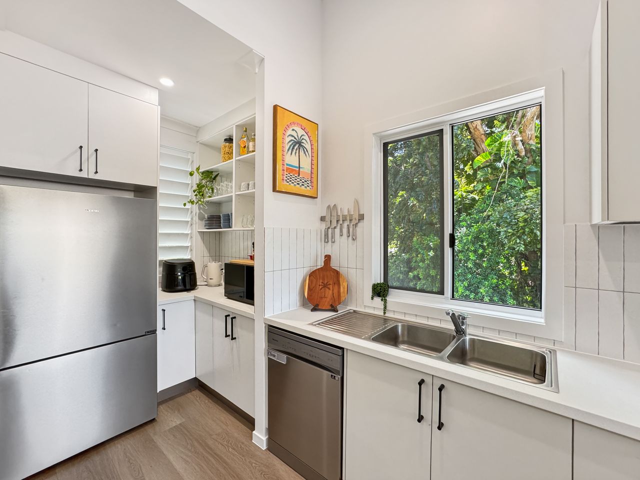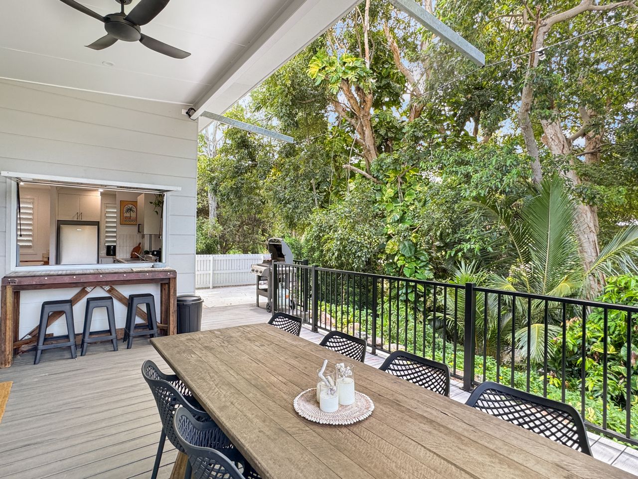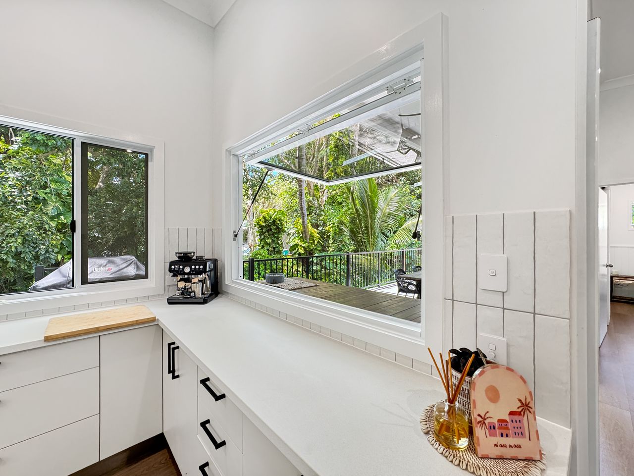 The heart of the home is a bright, open living area that encourages easy indoor-outdoor living. The kitchen and lounge connect seamlessly to an inviting outdoor space, perfect for long breakfasts, sunset dinners, or simply enjoying the cooling island breezes in a peaceful setting.