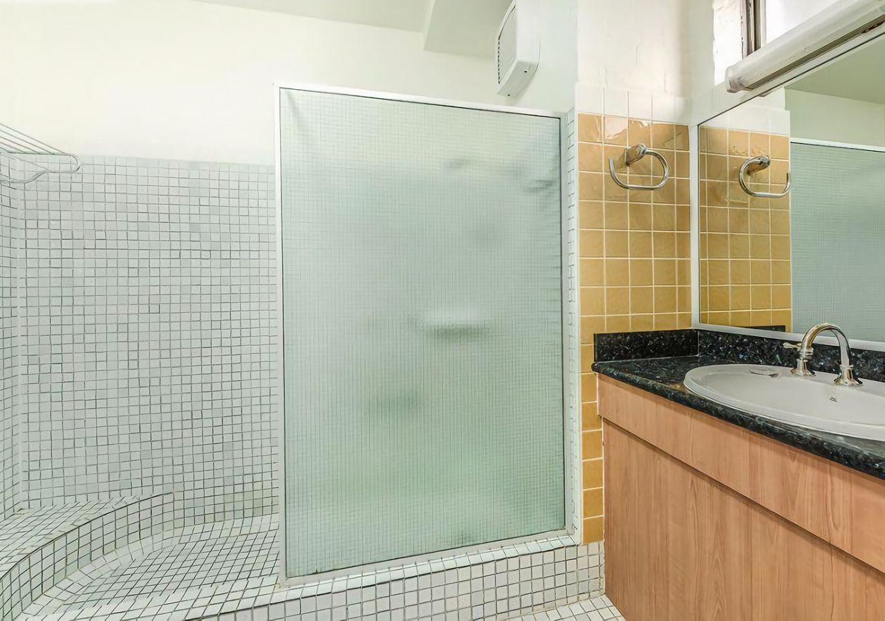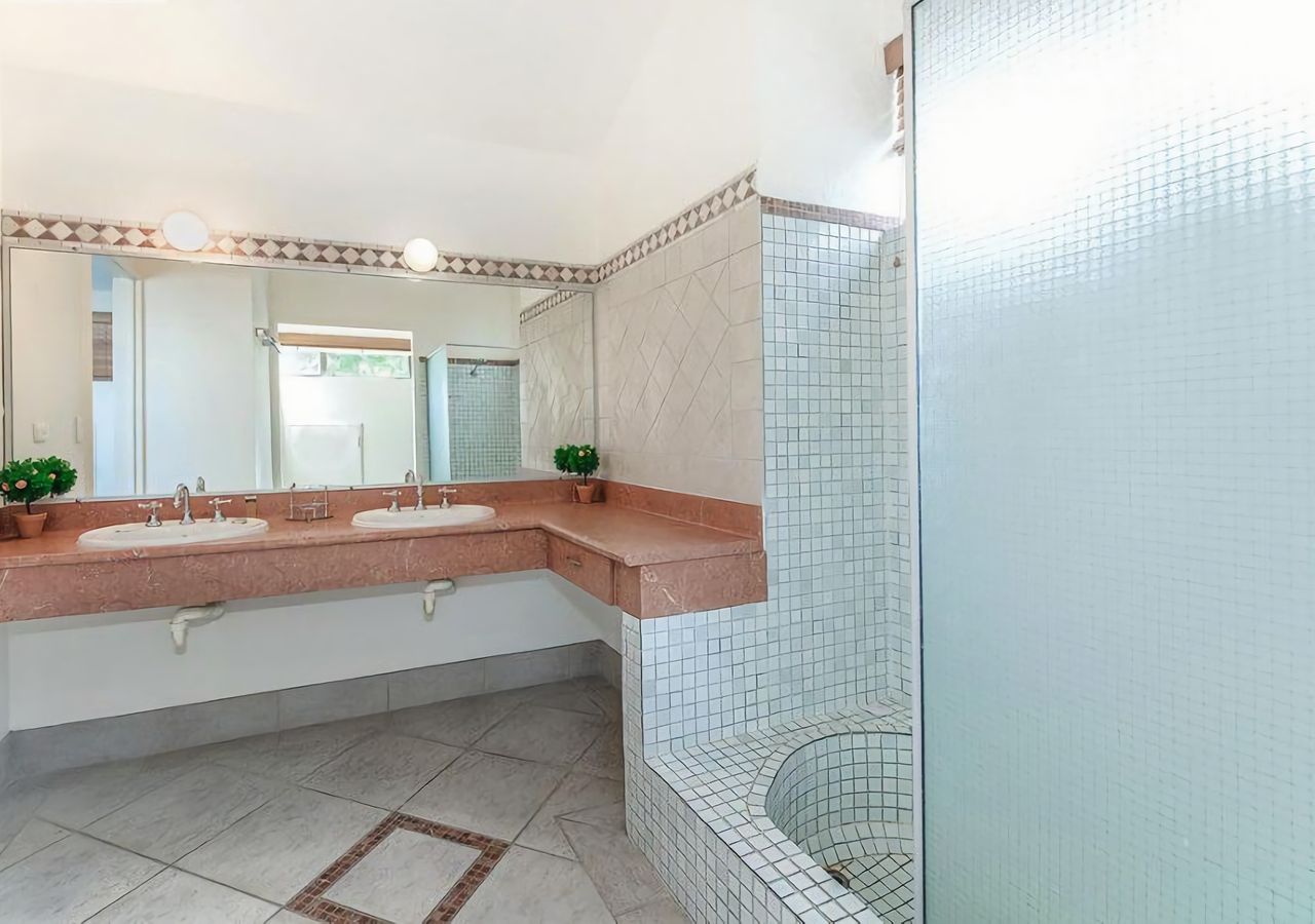 Our bedrooms include our master suite with a rooftop balcony and air conditioning, a ceiling fan, ensuite with a spa bath and a queen bed, while the other bedrooms downstairs are provided with fans, a queen bed and a double bed. The two main bathrooms have vanities and showers, as well as a bathtub in one.