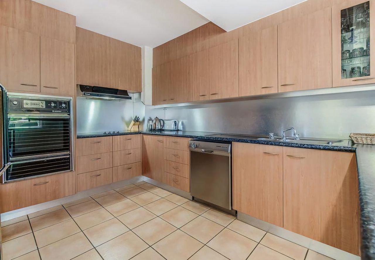 The living room features comfortable lounges to spend those lazier days on and an in-home theatre system with all your entertainment needs including wi-fi, a flat-screen TV, DVD player and CD player. There is air-conditioning also in the downstairs living room. This also leads into the open plan dining and a modern kitchen area which includes everything you need to make a home-cooked meal from the Noosa Farmers Markets, including a microwave and dishwasher. Off the dinning area, guests can walk out onto the balcony with outdoor furniture and the most spectacular park views.
