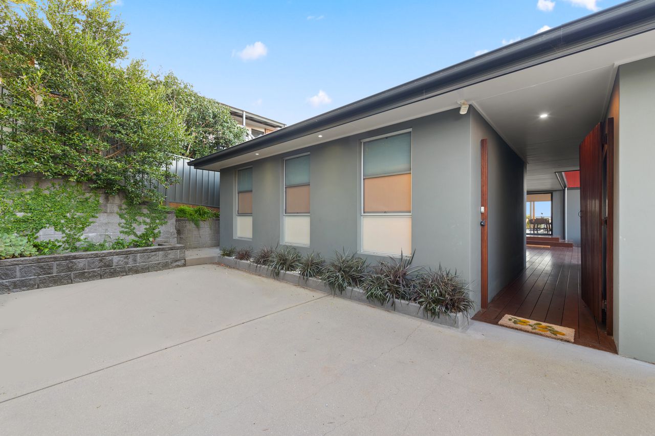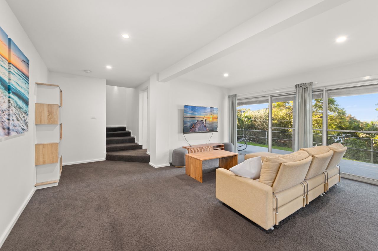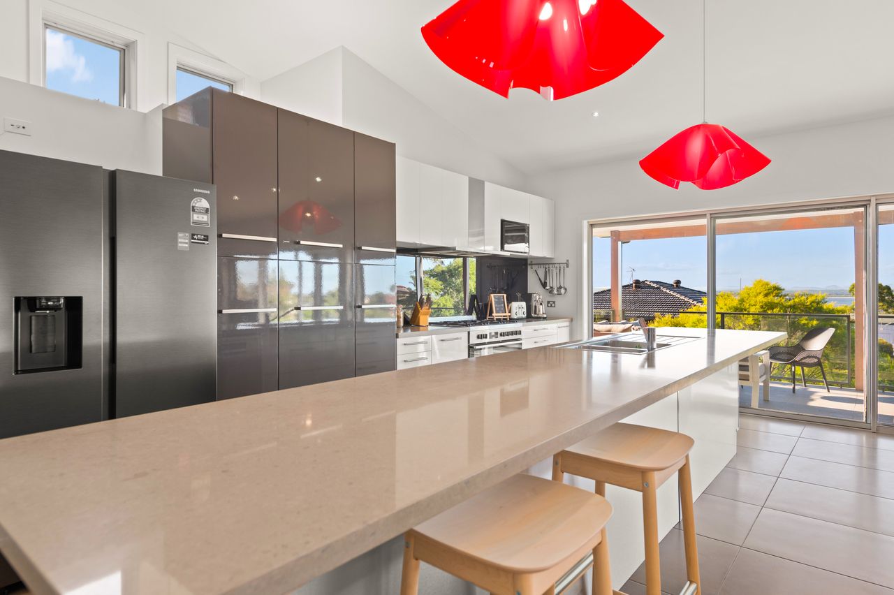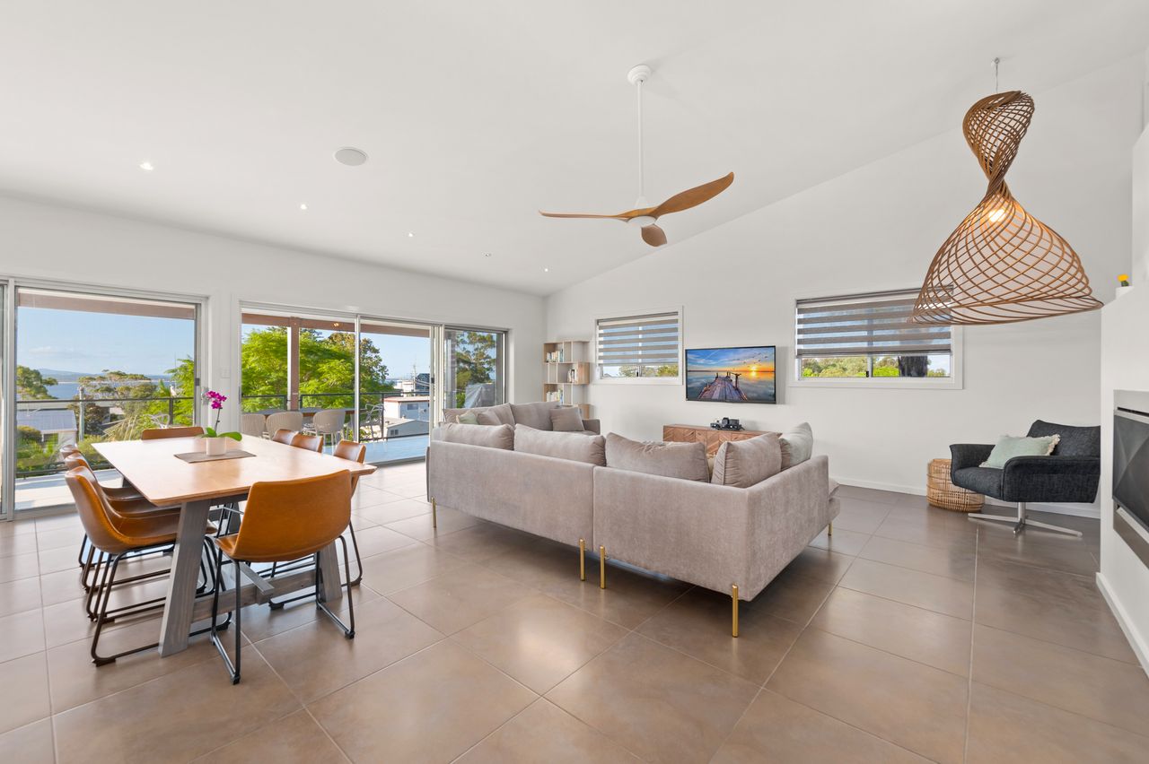 This contemporary, 2-storey holiday home with fantastic water views is the epitome of a dream coastal getaway for the whole family – including the furry family member! Just a 450m stroll takes you to Bagnalls Beach and you can follow the coast or cycle path to Dutchies Beach, which is very popular with families for its calm swimming waters and picturesque location. Both offer a playground and reserve with BBQ and picnic facilities. Further along the scenic coastline, or just over 1km more direct stroll from the house, is the heart of Nelson Bay and the d’Albora Marina. Head out on a dolphin or whale watch cruise, do some boutique shopping, enjoy drinks overlooking the water or dine at one of the award-winning restaurants.