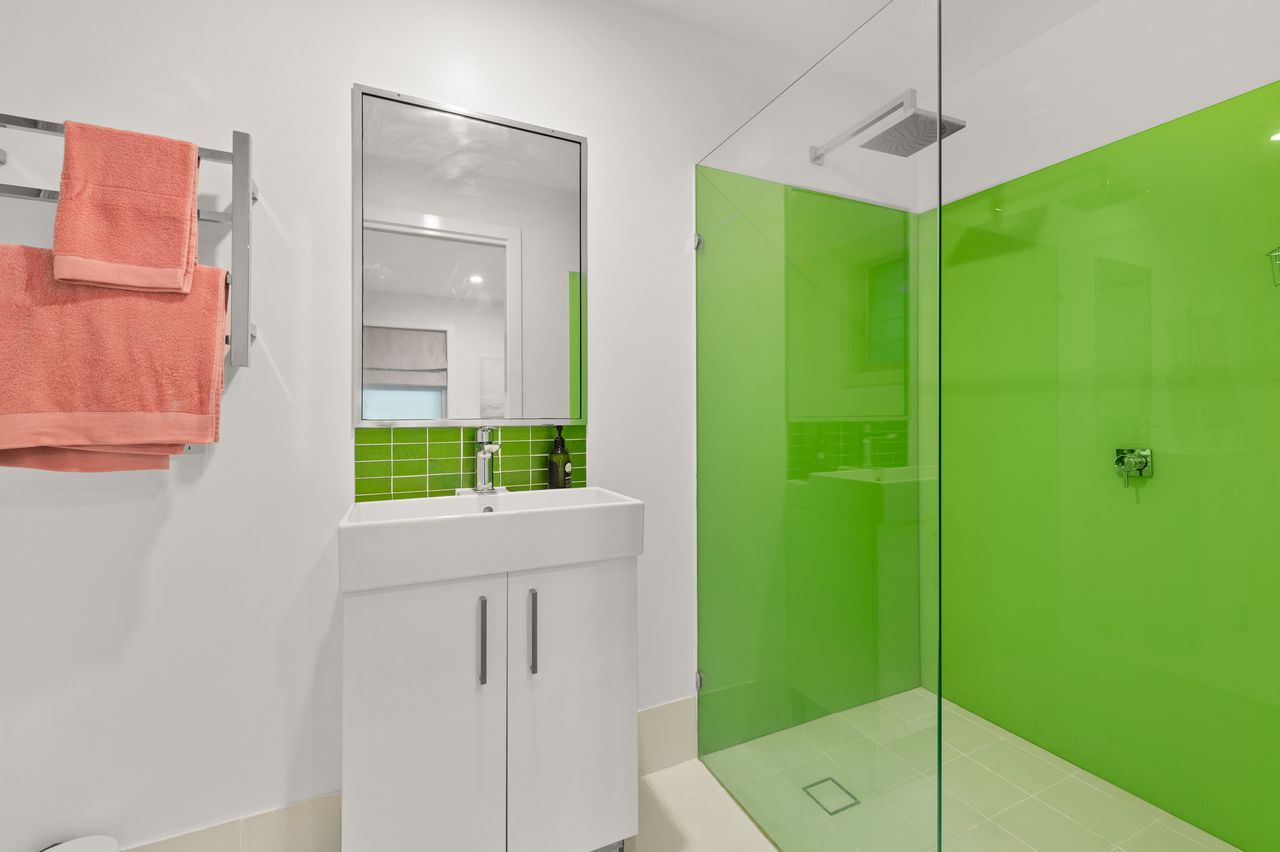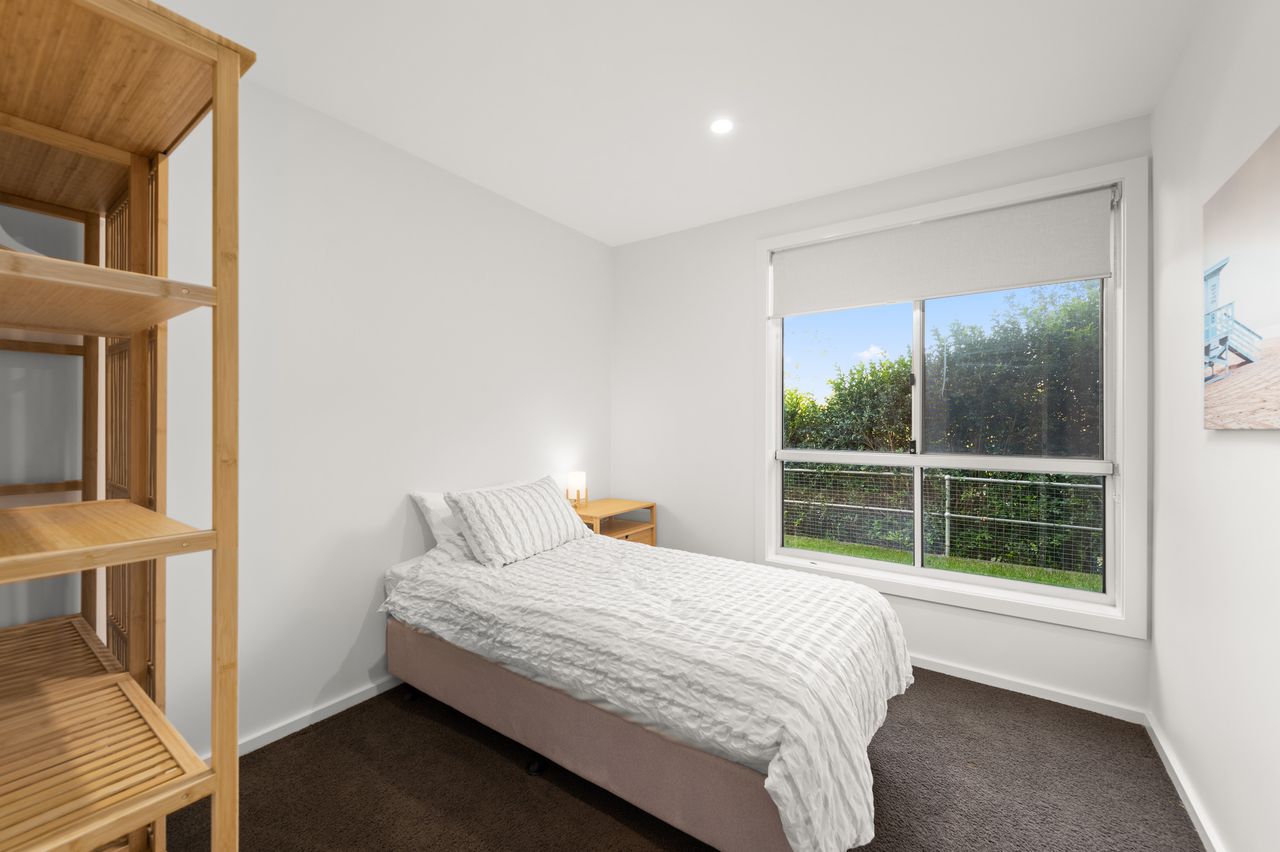 Enter on the top floor through a private undercover area with an outdoor lounge, to open plan living that flows out to the expansive north-facing balcony with gas BBQ, outdoor lounge and dining, and panoramic views over the surrounding area and across the water. The living area includes a fireplace, TV, Bluetooth sound system with surround sound and Wi-Fi, plus an 8-seater dining table, and the fully equipped kitchen includes a dishwasher, coffee machine and fridge with ice maker. This floor has 3 bedrooms, all with ceiling fans and built-in robes. Two bedrooms each have a queen bed, one of which also has a desk and ensuite bathroom with shower and toilet, and the third bedroom has 2 single beds. There is also a luxe bathroom with bathtub, shower and toilet.