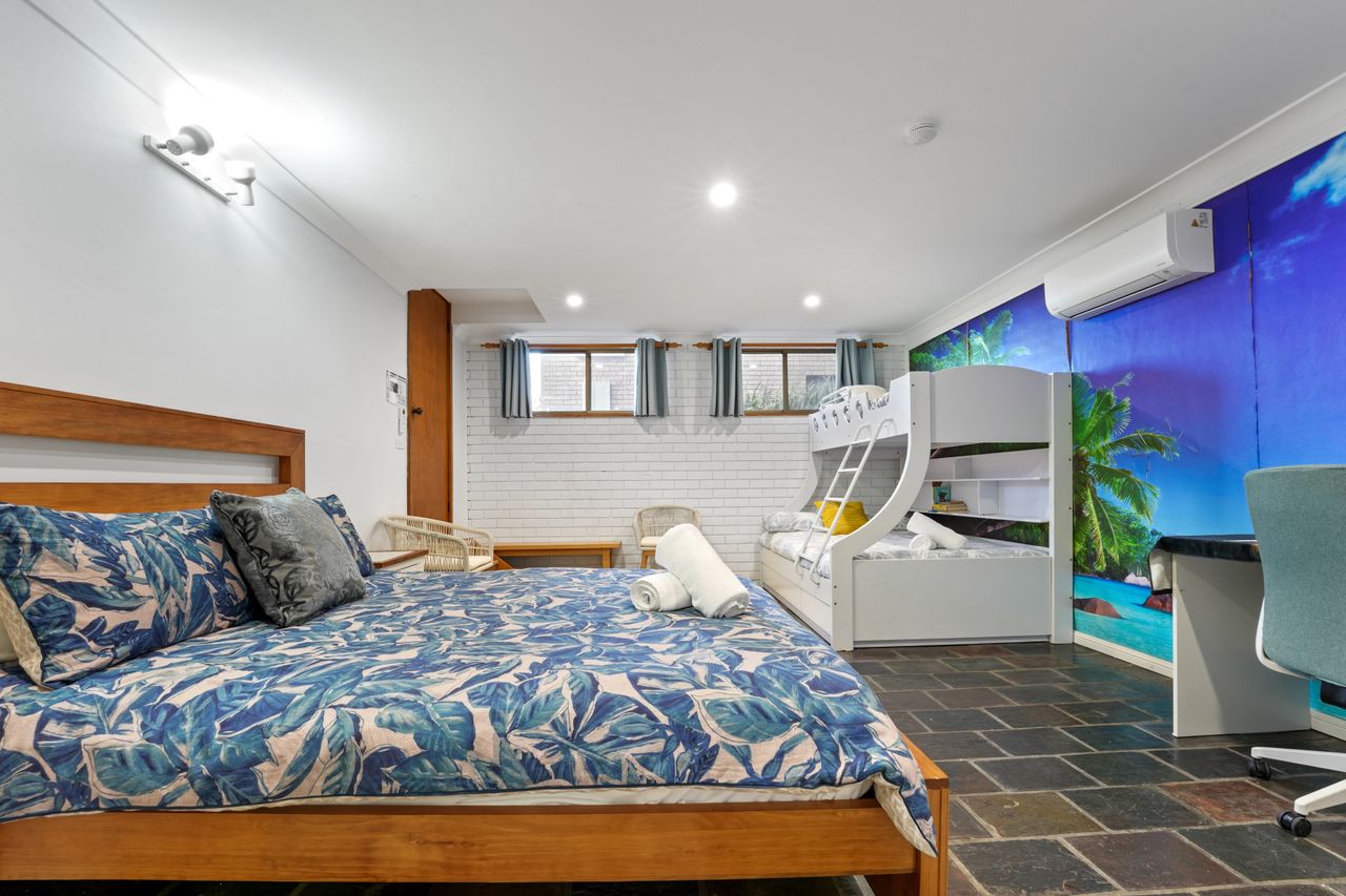 The home offers four well-sized bedrooms across two levels, providing flexibility and privacy for groups. The main bedroom includes its own ensuite, while additional bedrooms are thoughtfully positioned to suit families and guests of all ages. Multiple bathrooms and an internal laundry add everyday convenience throughout your stay.